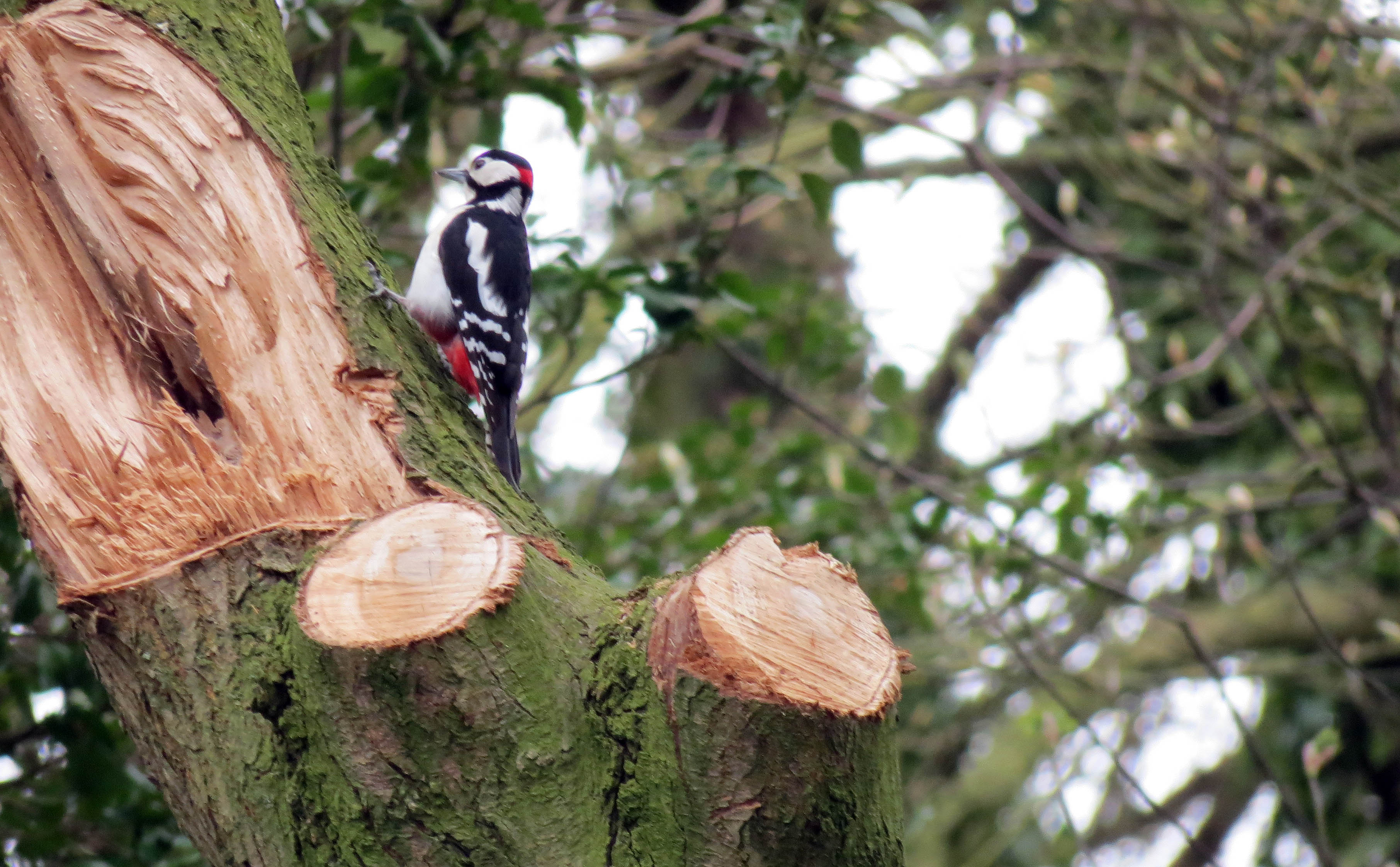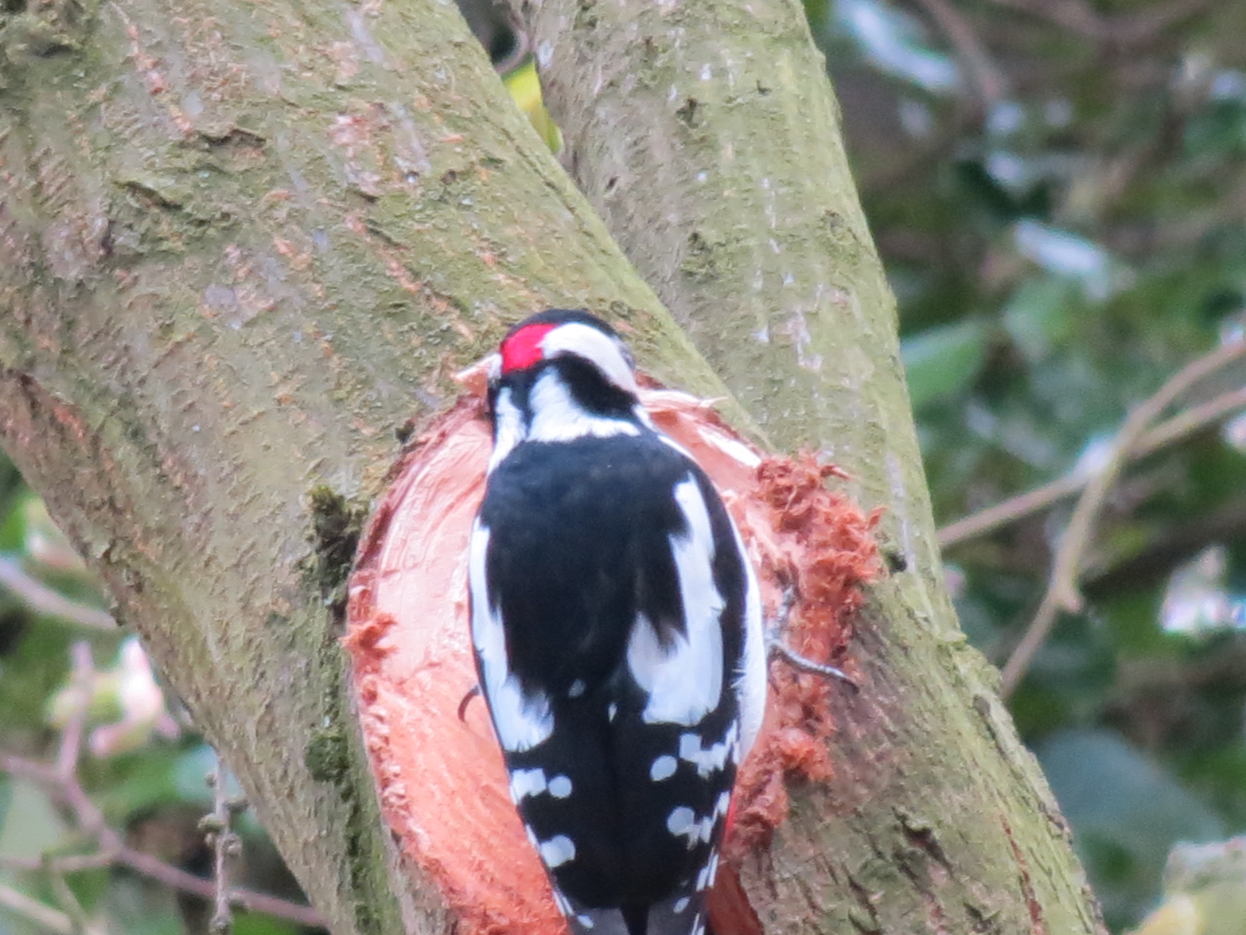 Anyway, whilst I was polishing away Roy heard a knocking noise…..quite a fast tapping. Wasn’t someone with a hammer kind of noise because it was going so fast it would have been impossible to do………stick with me here…….I am trying to describe the noise………like a pneumatic drill but quieter???………..Can’t think how else to describe it so I will just have to tell you……. it was a Woodepecker. Never seen one in my entire life before. Got my camera out, nearly fell over Roy and all his toolboxes he had got out just so I could get a photo. The bloody thing kept running up the tree every time I tried to zoom in on him. Anyway, eventually I got myself an amazing photo…….