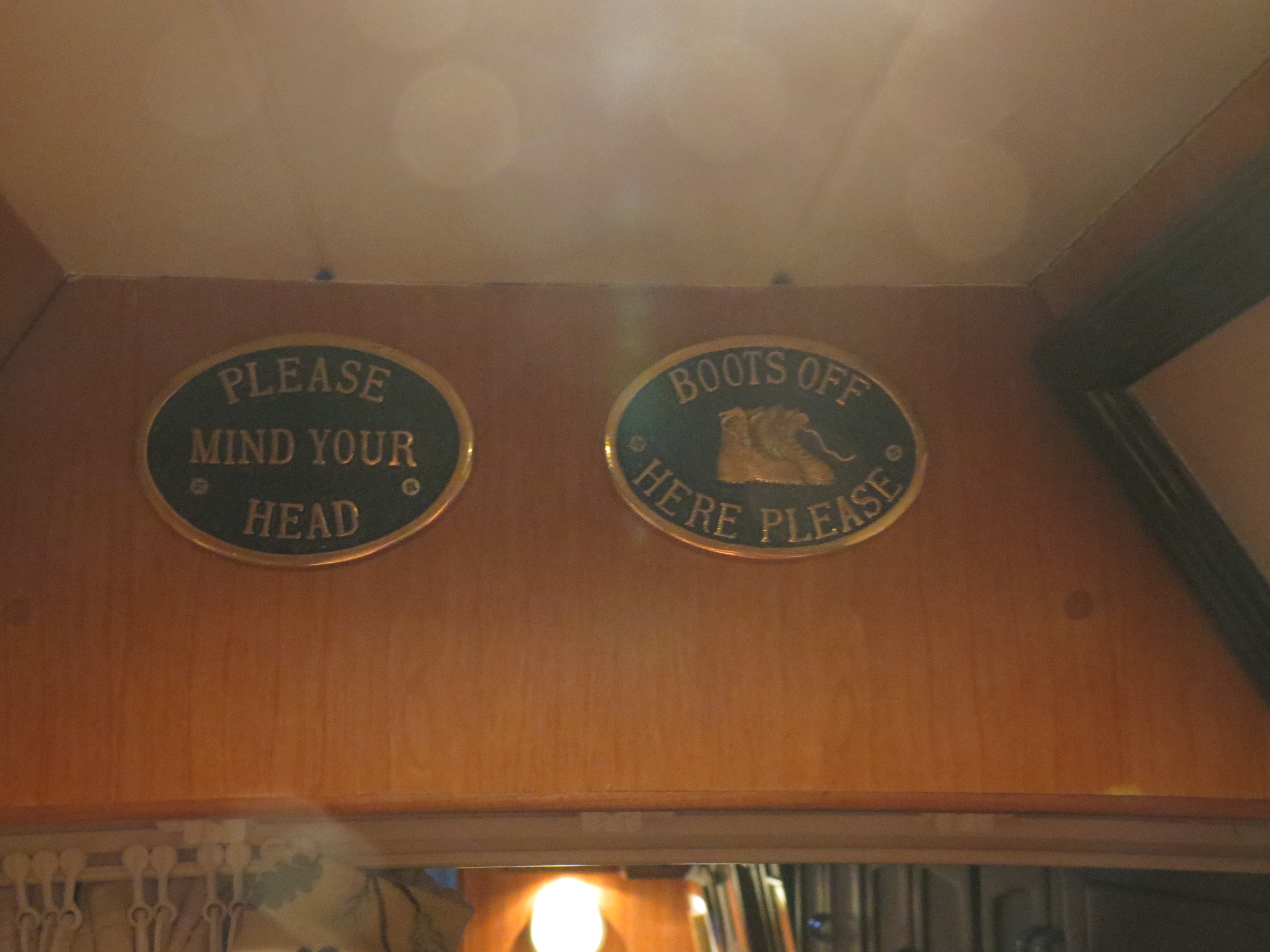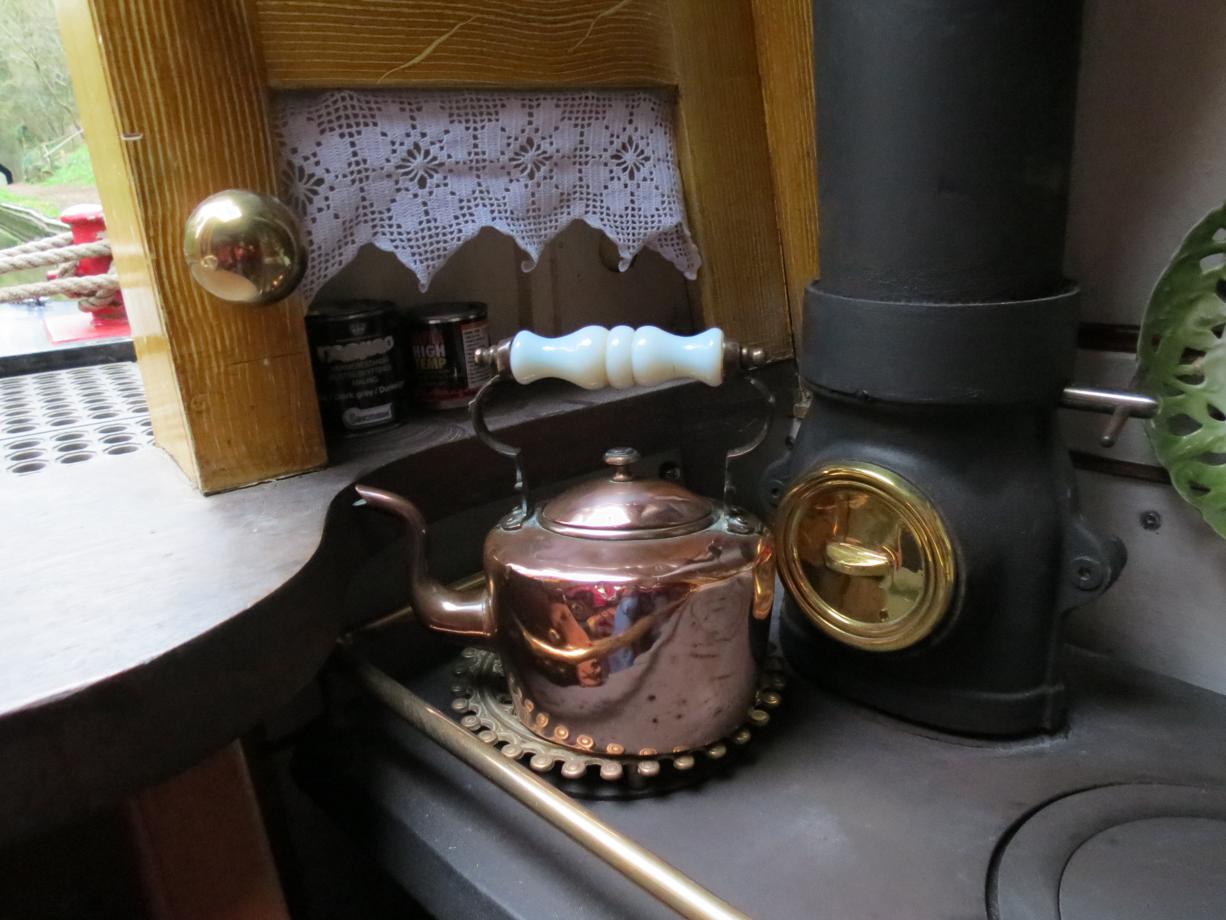 Arrived in Gnosall late afternoon today where we have stopped and done a few jobs. Roy has actually put up a couple of those plaques I bought yesterday. He must have taken the hint from reading the blog!! He has also finished putting all the plates up that he has bought from e-bay. He has had some good bargains. I polished up the copper kettle and also the claxon. Kept rubbing so hard that I thought a genie might appear at any minute.