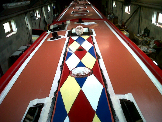 I can see the hand rails (bright red, gorgeous colour), the harlequin pattern on the roof (WOW, amazing), part of the bow colours ( Gosh it is so neat)……What else can I see…….Tigger??