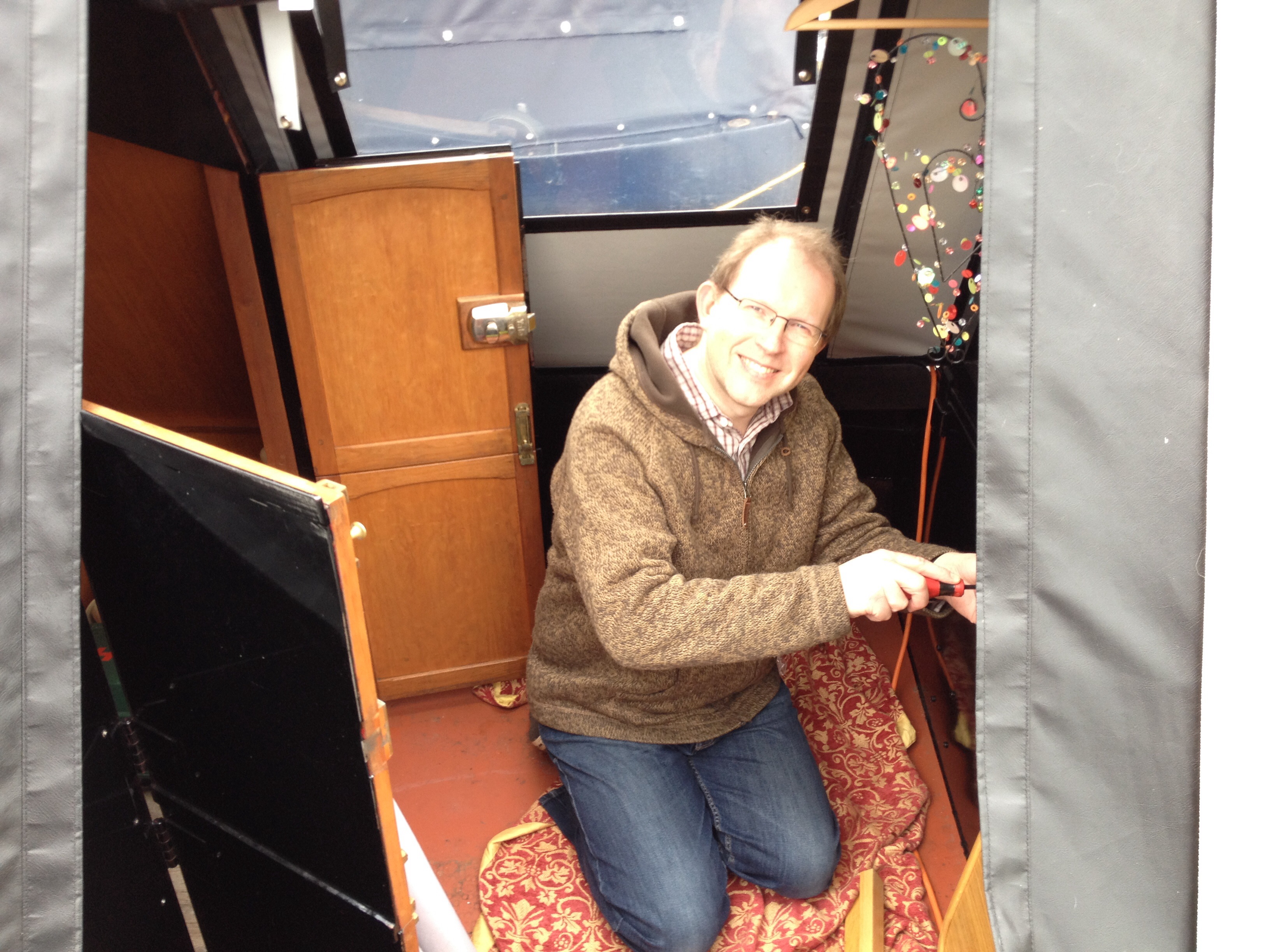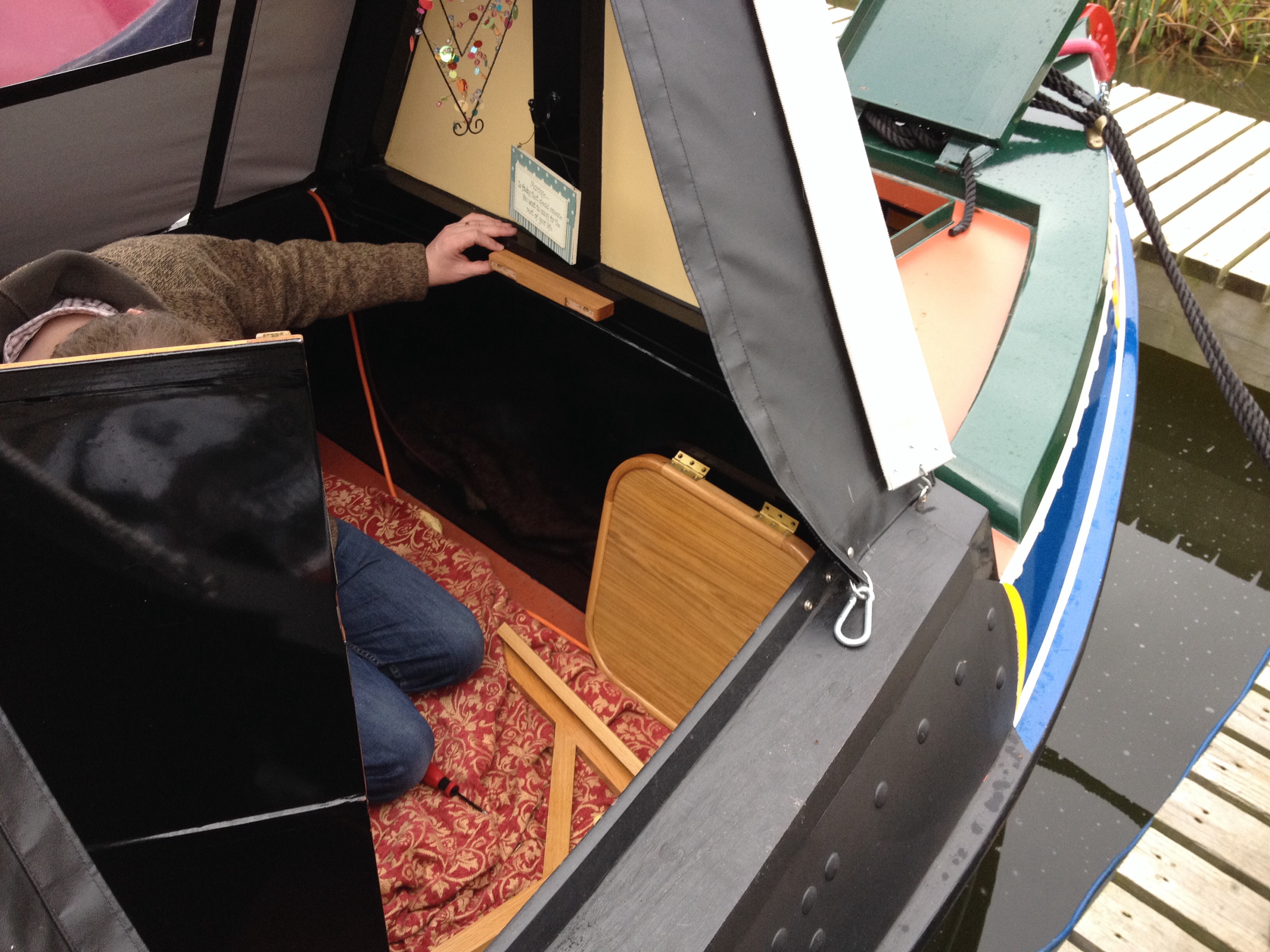 imageWe emptied all the front cratch area today and gave everywhere a good clean and finally Roy has finished varnishing and putting the new front cratch table up. This will be handy to use when sitting at the front for cups of tea etc and the all important piece of cake 🙂