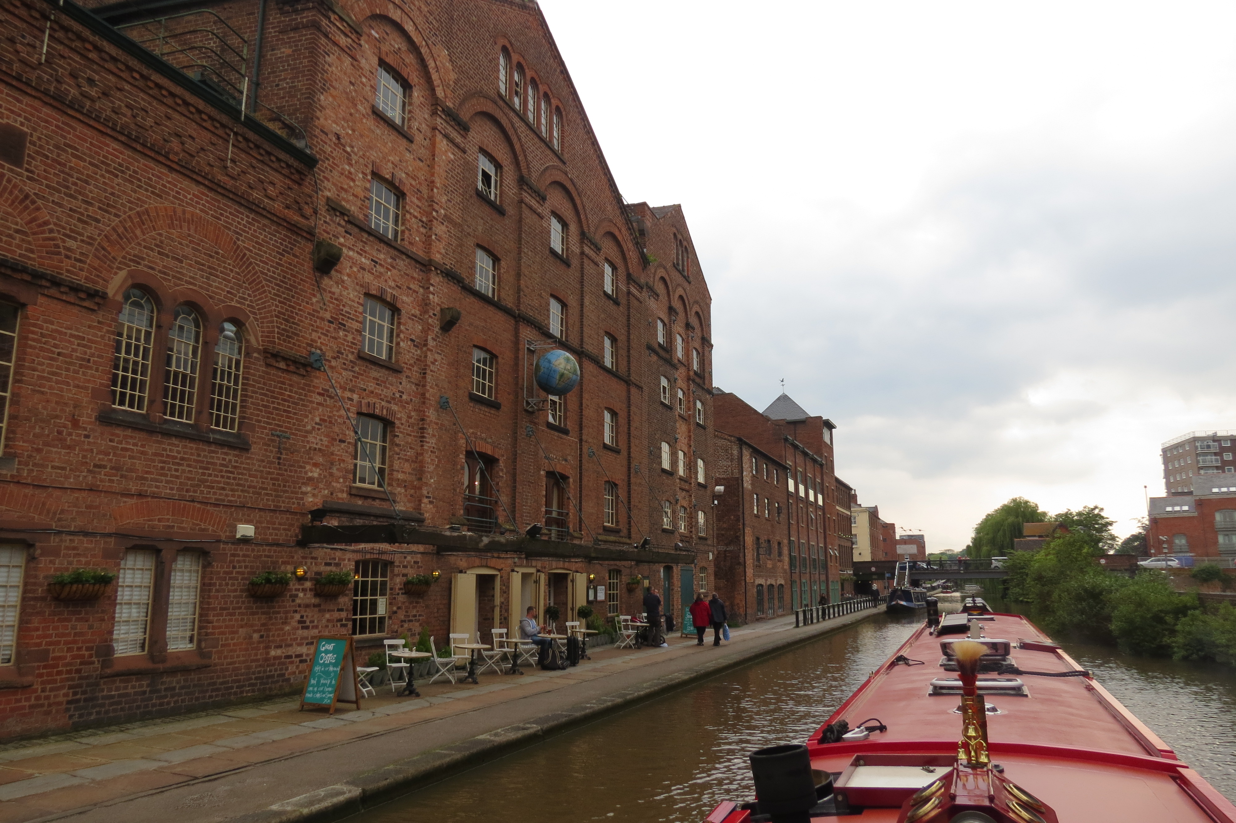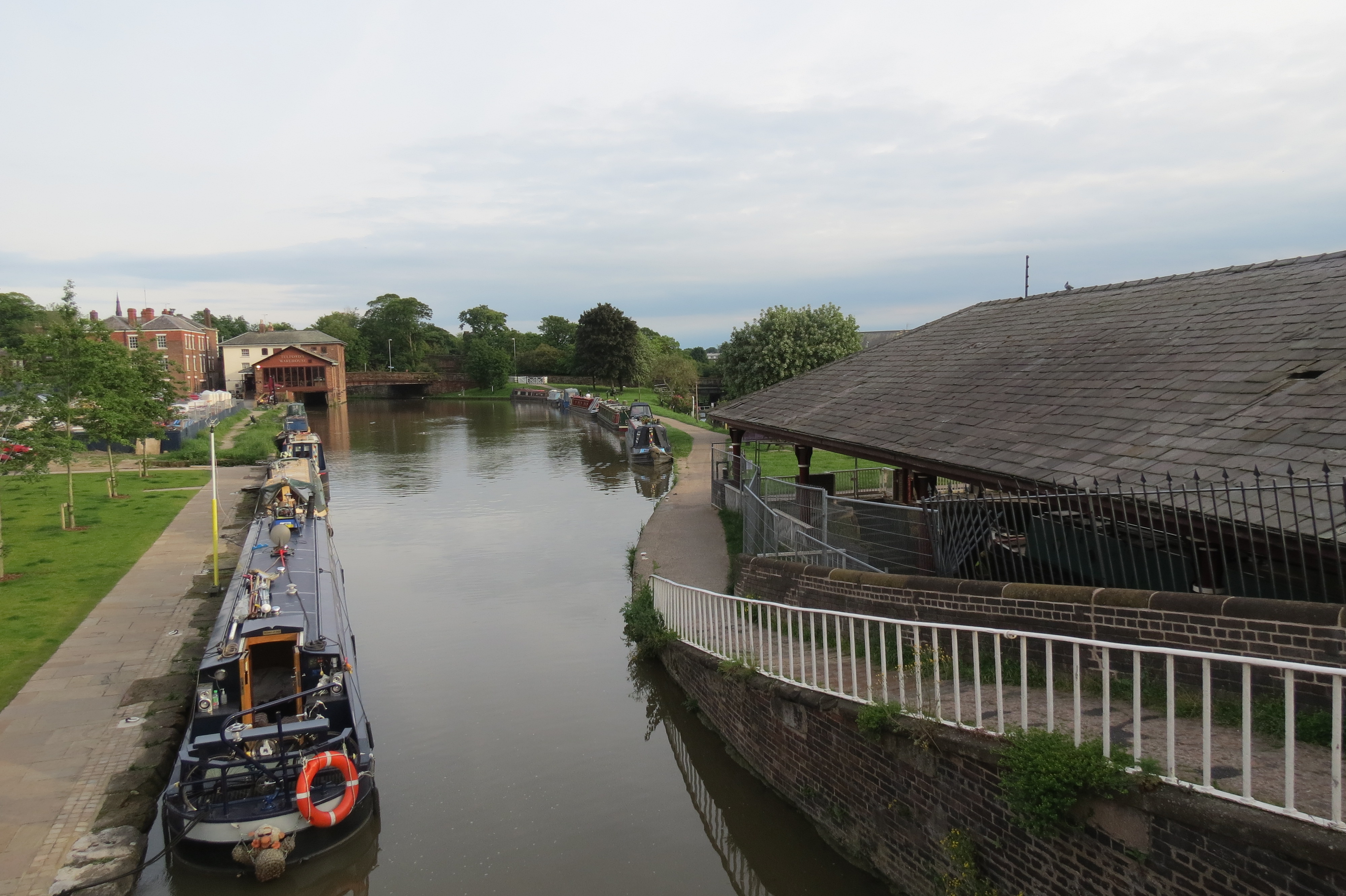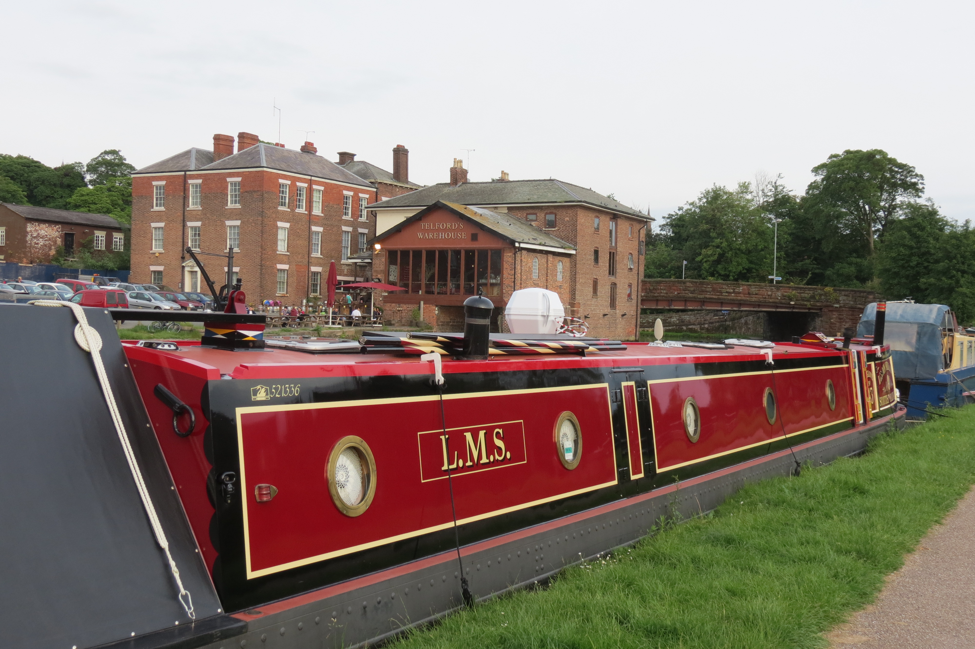 photo 1We moored up not long after the locks to receive a phone call from Wendy & Phil from NB Top Notch, who we have made friends with a few months ago and got on with so well. photo 3They were just about to have a drink in “Telfords Warehouse” when they saw us moor up so they came and said hello. They are a great couple and have a good sense of humour. They must have a good sense of humour because Wendy let me deface her Prada bag with one of my knitted roses!! Lovely to see you both  W & P. !! Already looking forward to next week.