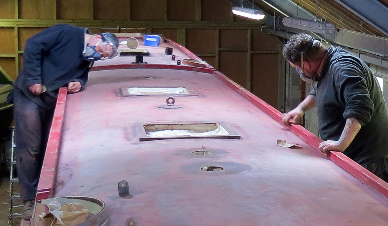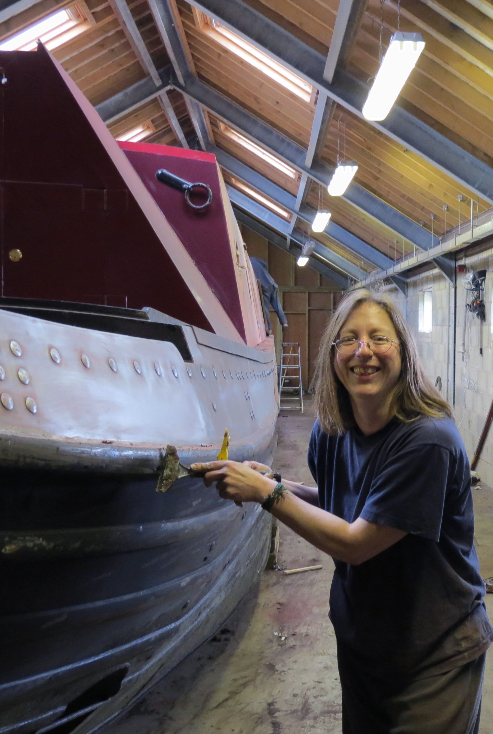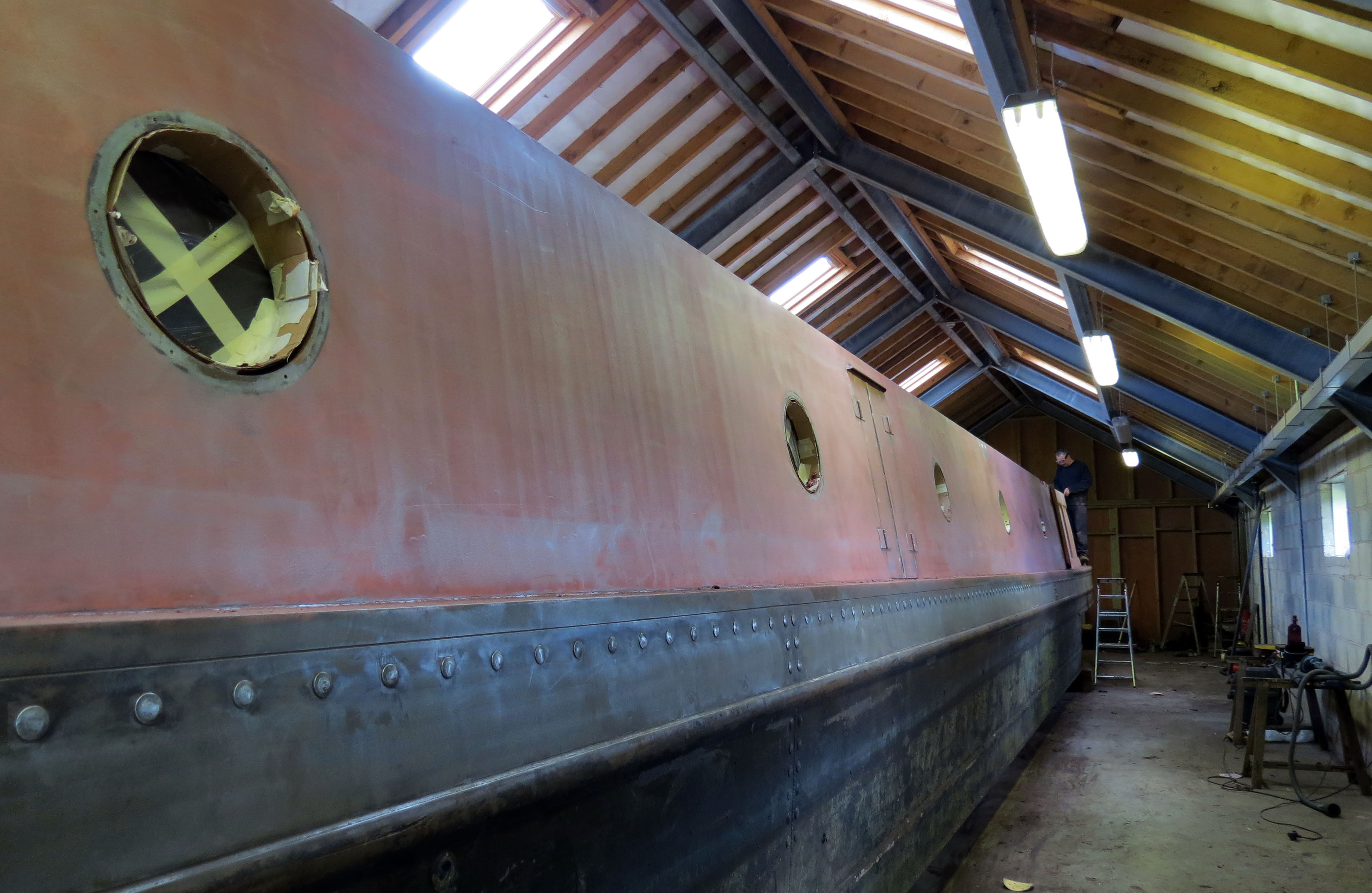 This is how Foxglove was originally done. There are rivets all the way round the boat on the part that is going to be black and we asked Sally if she can paint every rivet white. There must be at least a 300 rivets to paint which are about an inch in diameter each. Sally was very polite and said o.k we can do that. Much to her relief we were only kidding her!! We are not having every rivet painted white, they will be red………still joking!!!